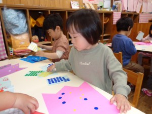 いろいろな色や大きさのシールを好きなところだったり並べたり、つなげたりしてペタペタと貼って楽しんでいました♪