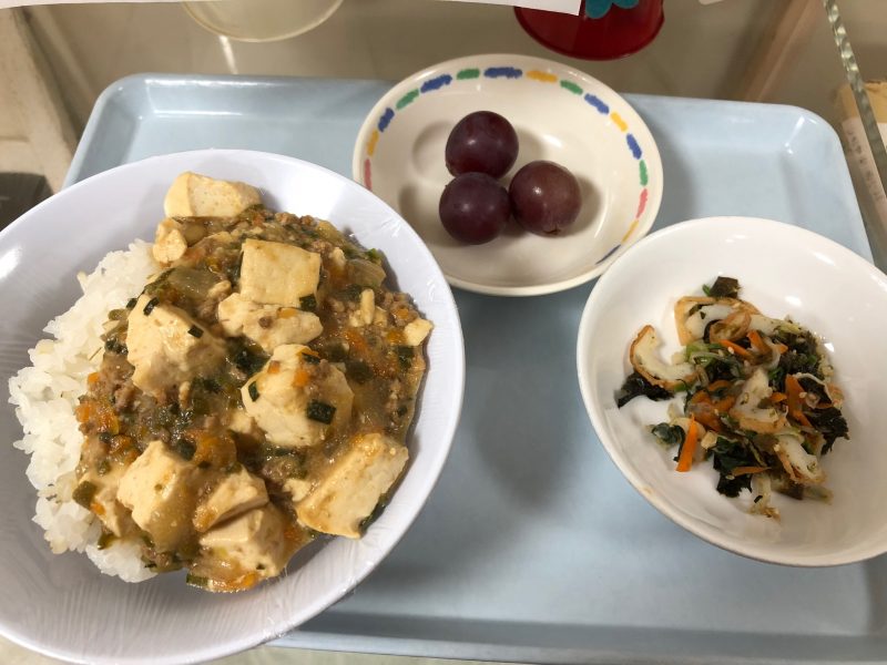 マーボー丼、磯香和え、ぶどうでした。