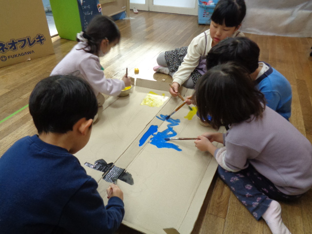 まずは色を決めてから、なにを描くか、誰がどの部分を描くか、話し合いながら決めました。