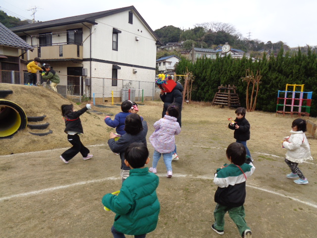 みどりぐみさん、お面のほかに、みんなで大きい鬼を作りました。