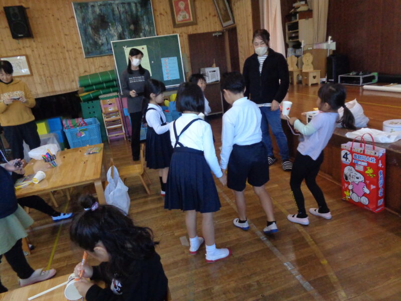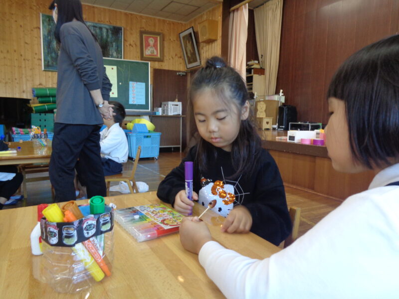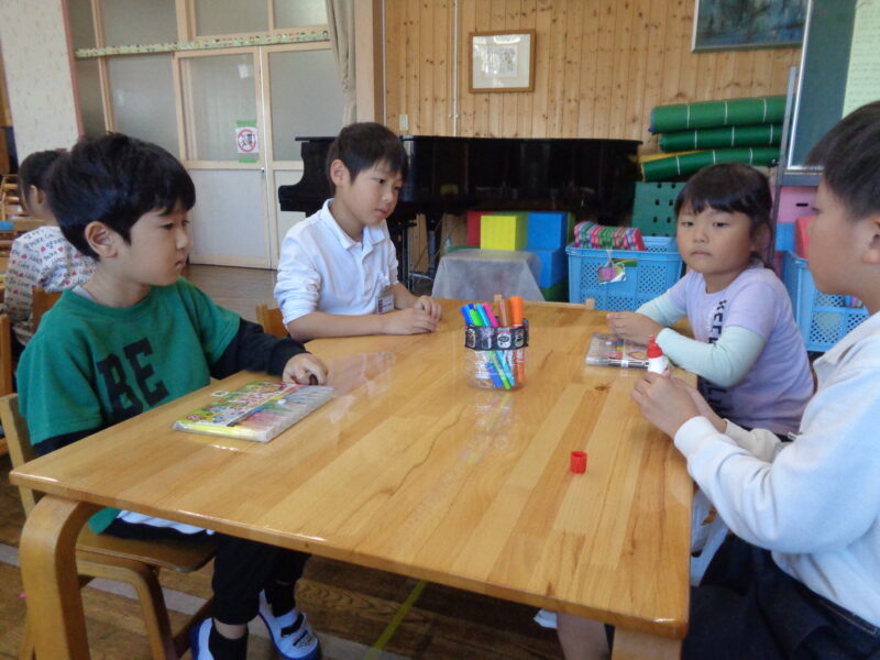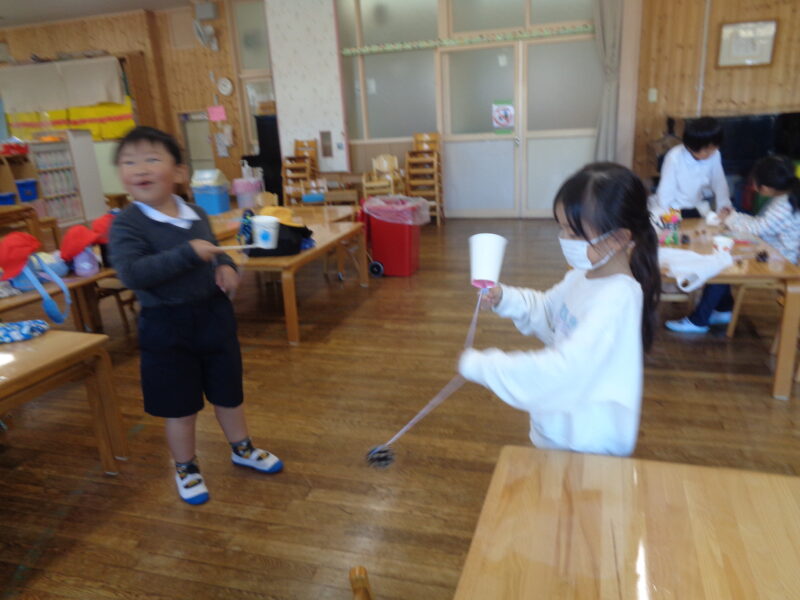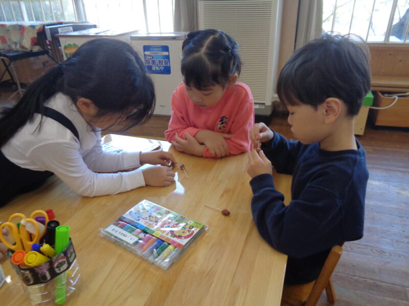 小学生と交流 2025.11.08/ 保育のひとコマ 本村小学校の1年生が、保育園に遊びに来てくれました。 小学校の先生の話をしっかり聞いて、ドングリごまと まつぼっくりのけん玉を作りました。 最初は緊張していましたが、優しい1年生のおかげで 少しずついつもの調子が出ていました。 作った物で一緒に遊びました。 1 回