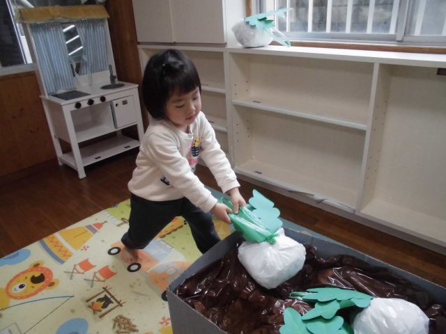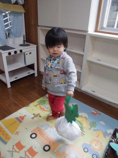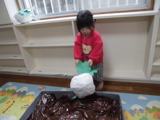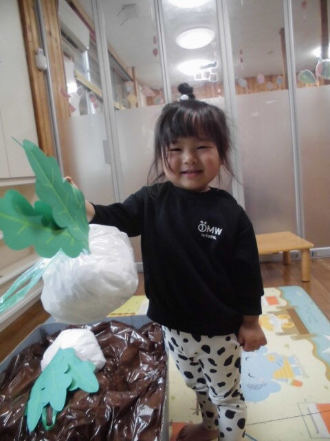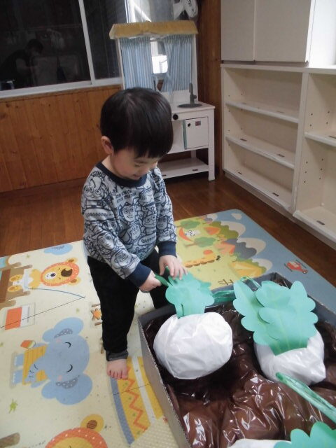 畑に見立てた段ボールの中にかぶが入っています。