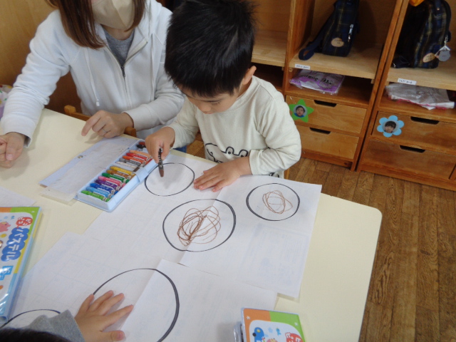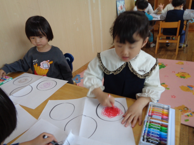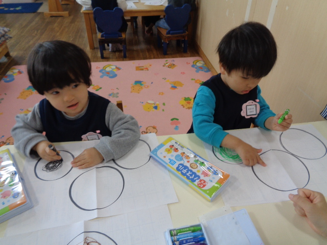 保育者が白い紙に丸を3個描いておき、