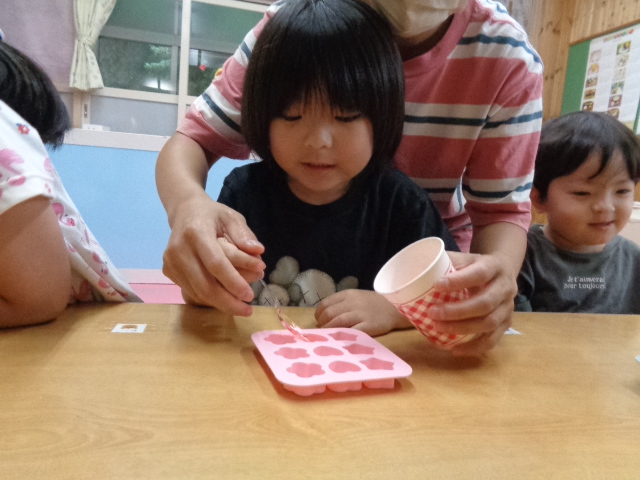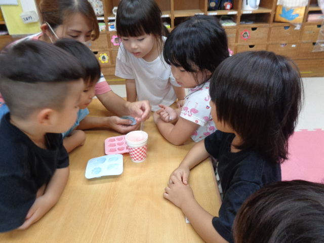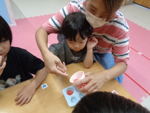 赤、黄色、オレンジの液をハートや星、クジラやカメなど様々な型に流しいれていきました。