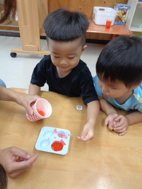 一人ひとり好きな絵や模様を描いていき、色が浮かび上がることを楽しんでいました。